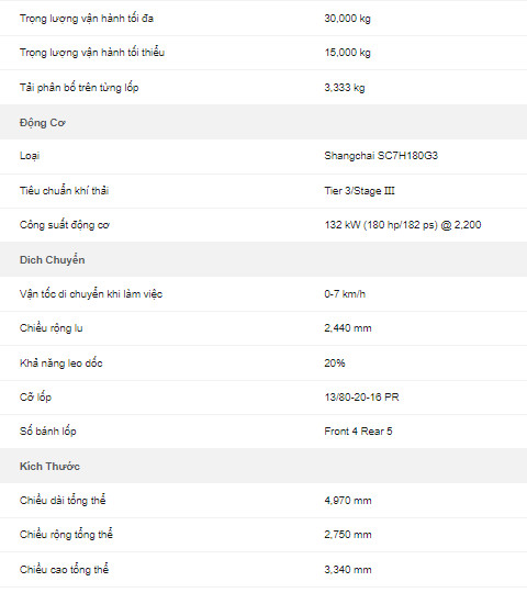 THÔNG SỐ KỸ THUẬT MÁY LU TĨNH 30 TẤN