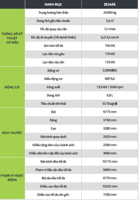 THÔNG SỐ KỸ THUẬT MÁY XÚC ĐÀO BÁNH XÍCH ZOOMLION ZE245