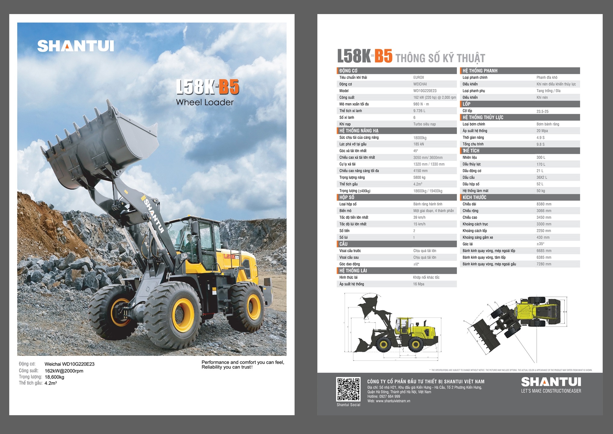 Máy xúc lật Shantui L58B5 gầu 4.2m3 được trang bị động cơ WEICHAI bản đủ E23 tuân thủ quy định phát thải máy móc theo tiêu chuẩn khí thải EURO II, có tính thông minh và hiệu quả cao, khả năng thay thế cao, chi phí bảo dưỡng thấp.