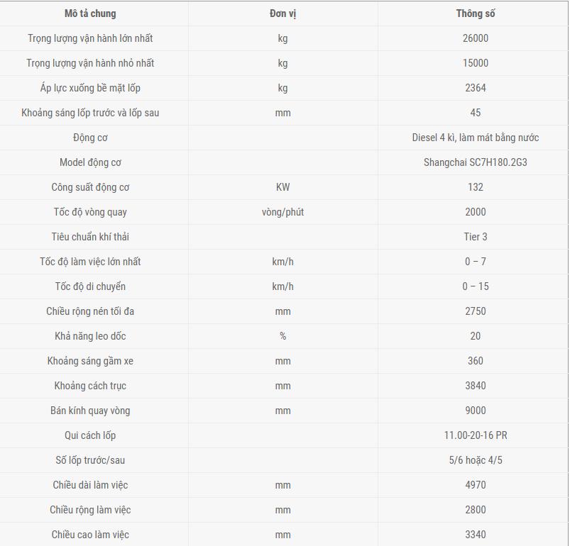 Thông số kỹ thuật của xe lu lốp Liugong 6526E: